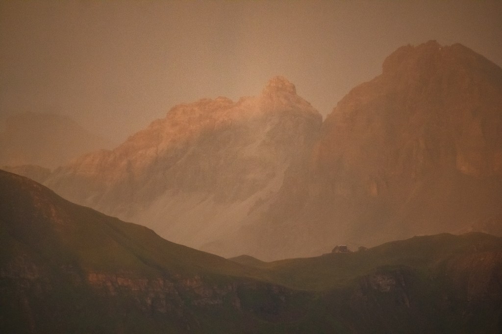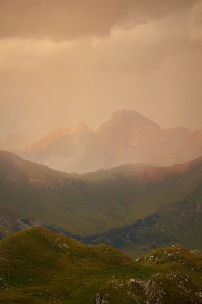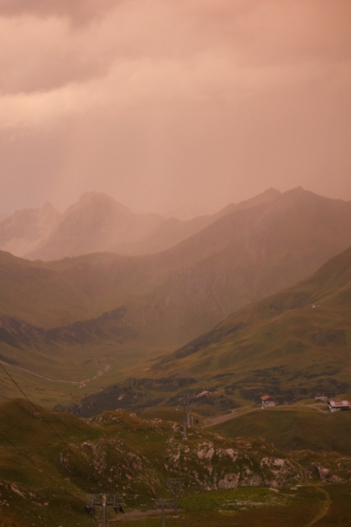 As the sun began to set, the sky turned into a palette of warm oranges, soft pinks, and the unmistakable yellow glow of a summer thunderstorm. The contrast between the stormy clouds and the glowing horizon made the moment feel almost magical, like the Alps were coming to life in a way I’d never seen before.
